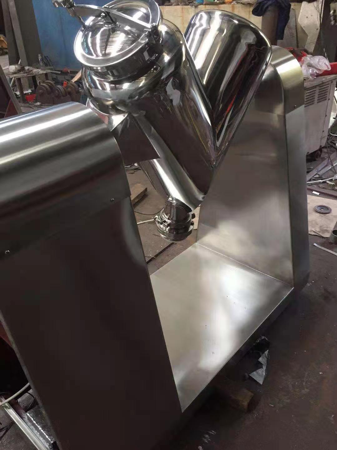 The V-type mixer consists of two cylinders welded together in a V-shape, and the shape of the container is asymmetrical with respect to the shaft. Due to the rotating motion, the powder particles are continuously alternating, divided and merged in the inclined cylinder. The material is randomly transferred from one V-shaped region to another region, and at the same time, there is slippage between the particles of the powder particles, which carries out multiple spatial superposition, and the particles are continuously distributed on the newly generated surface, so that the shear and diffusion motion are repeated, so as to achieve the purpose of mixing.